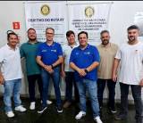 3 homens sentados, o do lado esquerdo com a camiseta do Rotary. Estão apoiados em uma mesa. Atrás em pé 10 homens, dentre eles 5 com a camiseta do Rotary.
