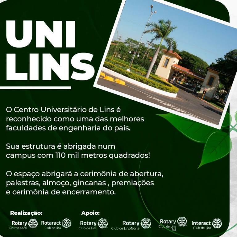 Parte inferior da esquerda para direita: realização e abaixo logo do distrito 4480, logo do Rotaract de Lins. Inferior central - apoio: logo do Rotary Club de Lins, Rotary Club de Lins Norte, Rotary Club de Lins Sul e Interact Club de Lins.