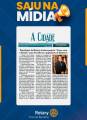 Um card azul com as laterais - lado esquerdo um risco amarelo na parte inferior vertical e lado direito o mesmo risco na parte superior. Ao centro em amarelo: saiu na e no branco: mídia finalizando com um pequeno megafone amarelo e branco. Abaixo a imagem de uma notícia em uma página de jornal A cidade.