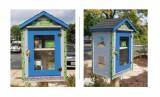 Um card fundo branco, dividido ao meio na vertical. Sendo que do lado esquerdo a imagem de uma casinha de madeira em um suporte de madeira redondo, colorida, porta azul transparente onde pode ver livros dentro. Ao lado direito a mesma imagem pegando a lateral.