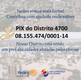 Abaixo lado esquerdo em contorno amarelo uma mão aberta e com um coração acima, na frente na cor preto em destaque: pix do distrito 4700 - 08.155.474/0001-14