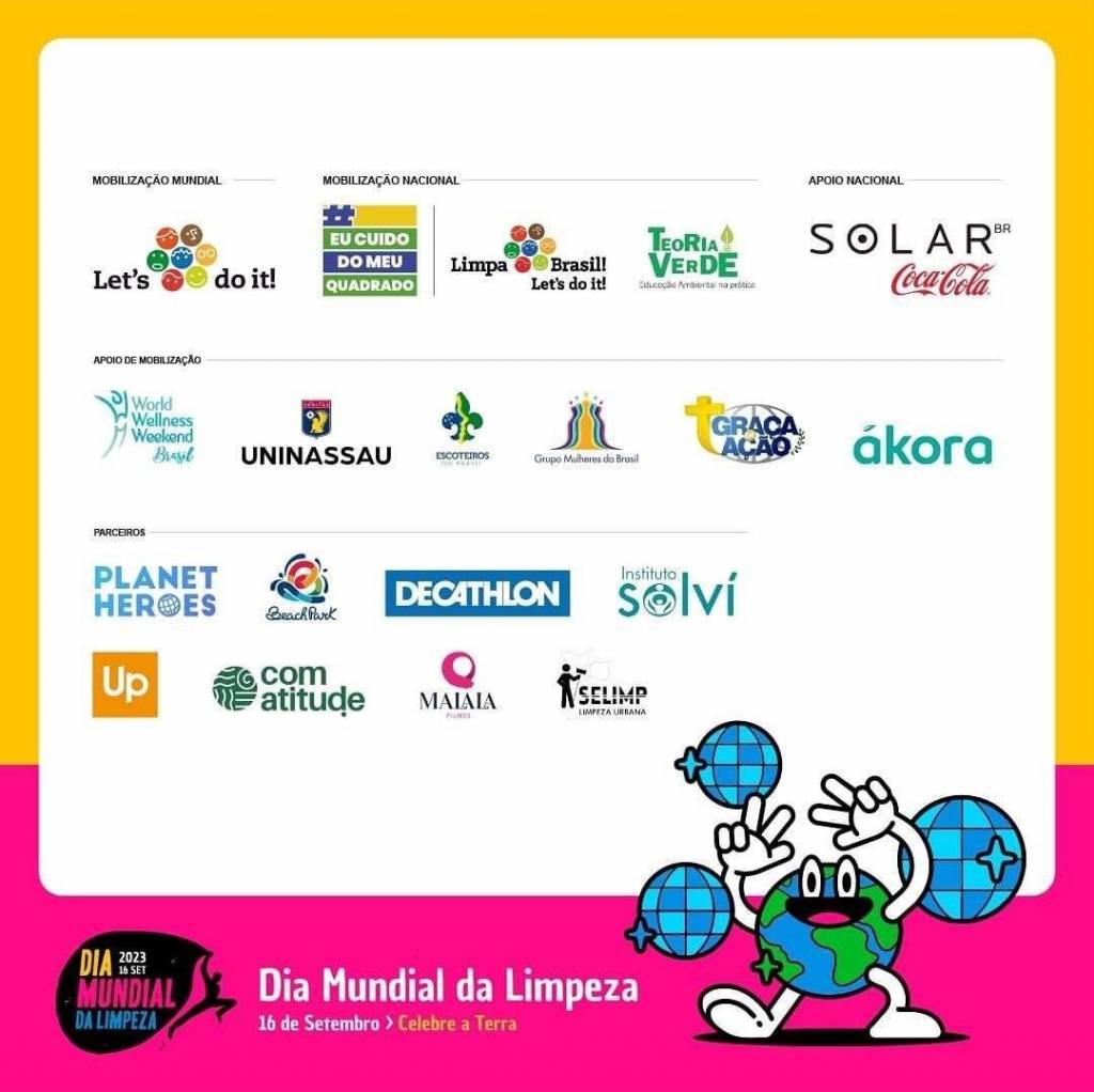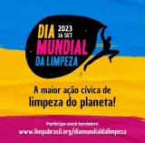 Na parte amarelo abaixo da imagem em preto: a maior ação cívica de limpeza do planeta.