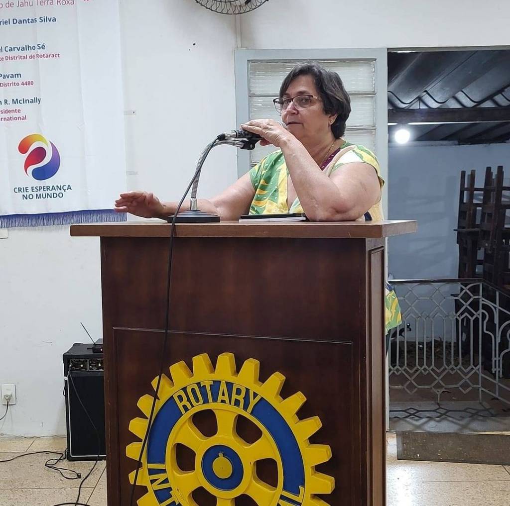 Em uma tribuna de madeira com o símbolo do rotary, uma mulher, cabelos grisalhos, camiseta azul do rotary, óculos, segurando uma revista e utilizando o microfone para falar.
