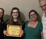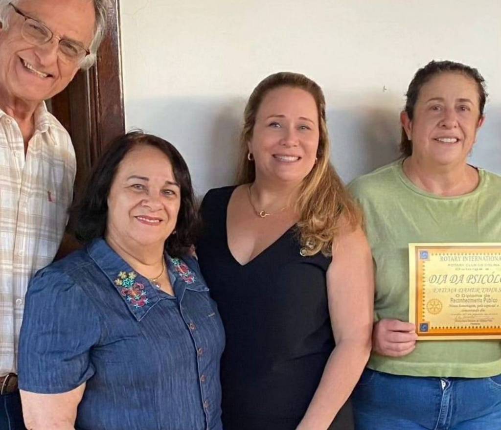 Ao seu lado uma mulher camisa azul e cabelos pretos, baixa; seguindo para a direita da imagem, uma mulher loira, cabelos longos de um lado do ombro esquerdo, roupa preta e uma mulher de blusa verde e calça jeans, cabelo preso, segurando um certificado. Todos sorrindo.