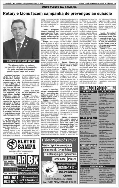 Imagem de uma página de revista ou jornal, no preto e branco. Tendo destaque na matéria: Rotary e Lions fazem campanha de prevenção ao suicídio.