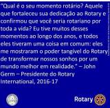 Card azul escrito em branco: "Qual é o seu momento rotário? Aquele que fortaleceu sua dedicação ao Rotary e confirmou que você seria rotariano por toda a vida? Eu tive muitos desses momentos ao longo dos anos, e todos eles tiveram uma coisa em comum: eles me mostraram o poder tangível do Rotary de transformar nossos sonhos por um