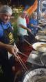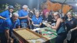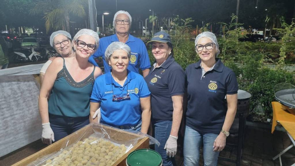 5 mulheres sorrindo e 1 homem, algumas usando camiseta do Rotary e calça jeans, usando toca de cozinha.