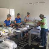 Ambiente de uma cozinha industrial, com várias panelas grandes sobre fogões industriais, lado esquerdo uma mulher, avental, toca, com