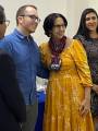 Da direita para a esquerda sentados atrás de uma mesa com toalha azul: casal Gov. Rita - vestido amarelo com detalhe em branco, lenço da gestão 2023/2024, óculos, braços cruzados sobre o colo, Gov.Pavam - terno preto, camisa branca, gravata, óculos, com as mãos sobre a mesa e uma folha branca e o boneco Pavam a sua frente, um homem de terno preto, camisa azul, gravata, óculos, mão direita sobre a mesa e mão esquerda rente ao corpo.