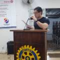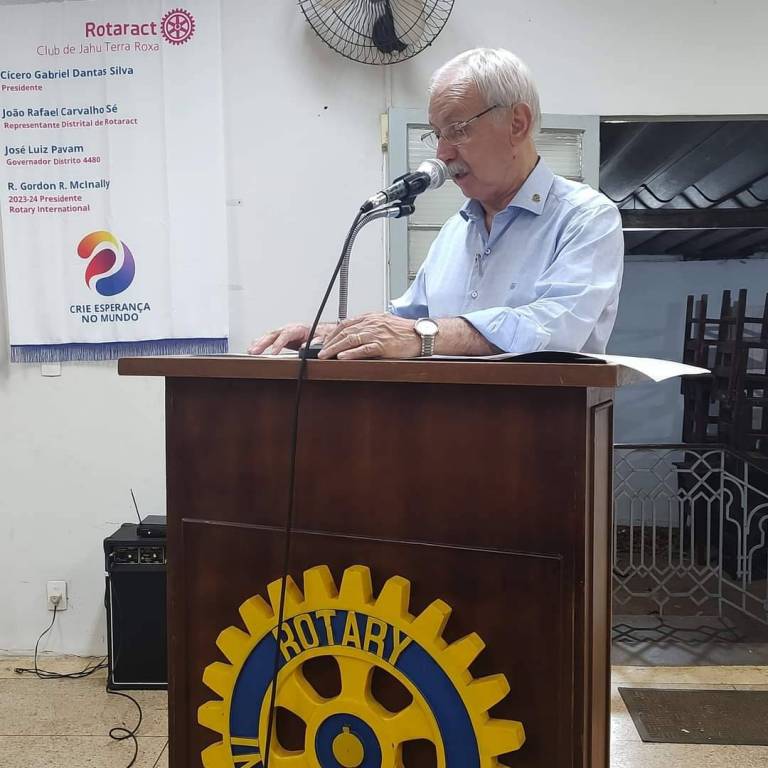 Ao fundo na parede o banner do Rotaract Club de Jahú Terra Roxa do lado esquerdo. Lado direito uma porta aberta.