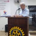 Um uma tribuna de madeira com o símbolo do Rotary, microfone, uma mulher vestido preto, óculos, cabelos grisalhos.