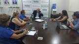 Em uma mesa oval grande de madeira, com vários papéis sobre ela, lado esquerdo o gov. Pavam de blaiser, no meio Governdador Assistente Maura, Governadora Lourdinha Dalto, de Catanduva e na outra extremidade uma pessoa de blusa azul do Rotary e calça jeans.