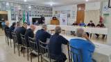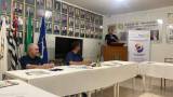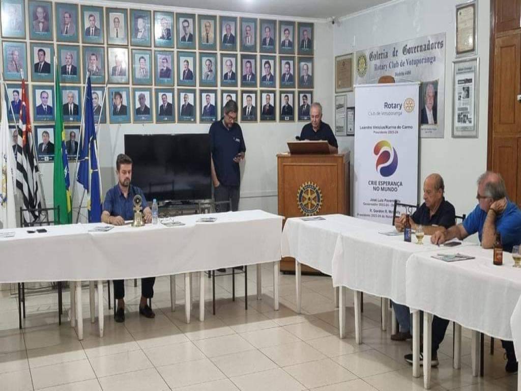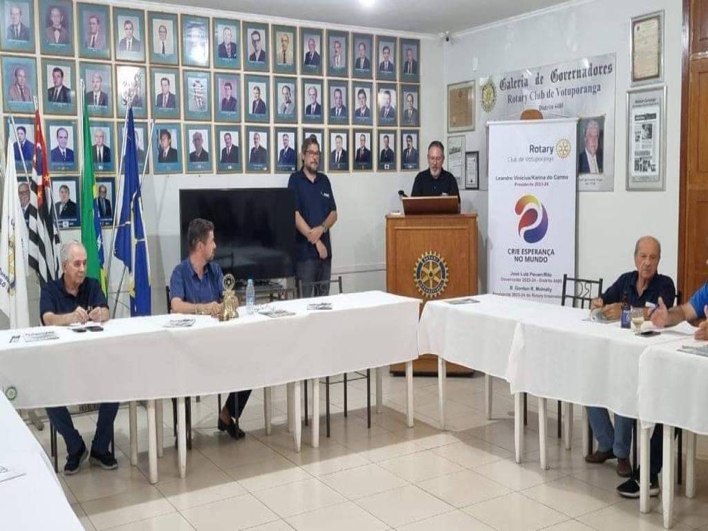 Audiodescrição: na foto a identificação de duas mesas em L, com toalha clara, lado esquerdo, dois homens sentados com braços em cima da mesa, do lado direito também. Atrás, um homem em pé, batendo palmas ao lado de uma TV desligada, e um outro atrás de uma tribuna com simbolo do rotary. Ao lado, um banner com simbolo do lema: crie esperança no mundo. Ao fundo, fotos de antigos presidente e o pavilhão de bandeiras.