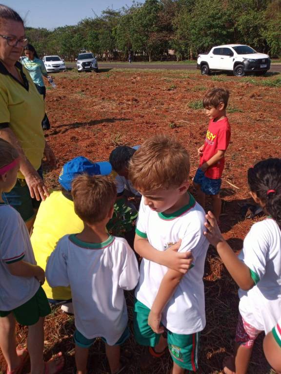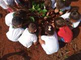 Nove crianças, formando uma roda fechada, onde estão plantando uma muda de árvore em um local com terra.