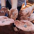 Foto da palma da mão esquerda com embalagem plástica escrita: girassol, 21 de Setembro, dia da árvore, contendo sementes de girassóis. Símbolo da Sabesp e da prefeitura de Lins.