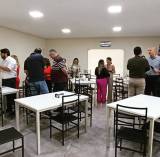 Várias pessoas conversando entre si, ocupando os lugares, (aproximadamente 6 mesas de 4 lugares).