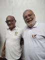 Seguindo um homem braços cruzados altura do peito, óculos, camiseta cor vinho e calça marrom, 1 homem moreno, calvo, óculos, camiseta branca do Rotary e calça jeans, braço direito rente ao corpo e esquerdo com a mão na cintura.