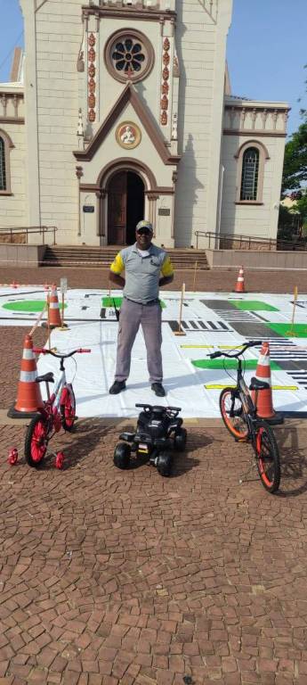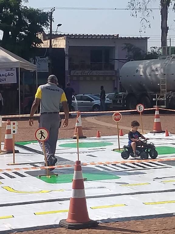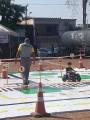 A volta deste grande simulado de trânsito, existe cones para sinalizar o local utilizado. Adulto ao redor observando.