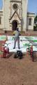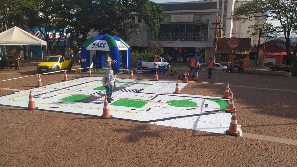 No chão com fundo branco, uma grande simulação de ruas, com sinalizações. Parece estar em uma praça pública defronte uma igreja.