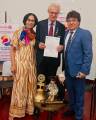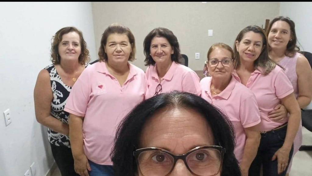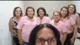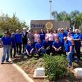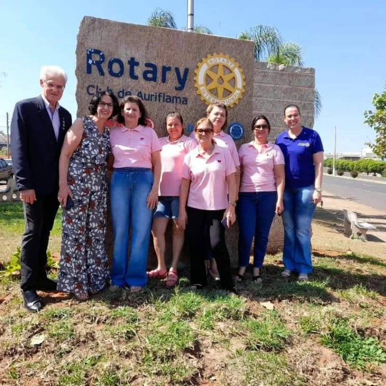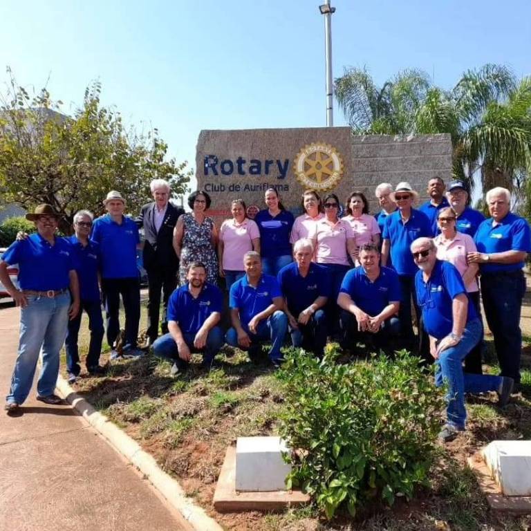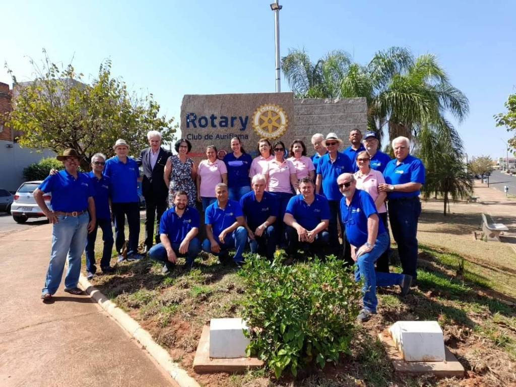 No Marco rotário de Auriflama, da esquerda para a direita: 3 homens de camiseta azul do Rotary, calça jeans, 2 deles de chapéu. Em seguida o casal Gov.Pam de terno, Rita de vestido estampado, cavado, seguindo 5 mulheres, e 5 homens e uma mulher a frente deles. Todos em pé, um ao lado do outro.
