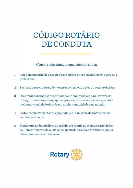 5. Manter um ambiente livre de assédio em reuniões, eventos e atividades do Rotary, reportando qualquer suspeita de assédio e garantindo que as vítimas não sofram retaliação.