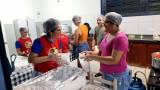 Ao fundo mais 4 mulheres e 1 homem. Todos trabalhando em um local parecer cozinha. Local fechado.