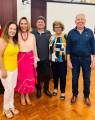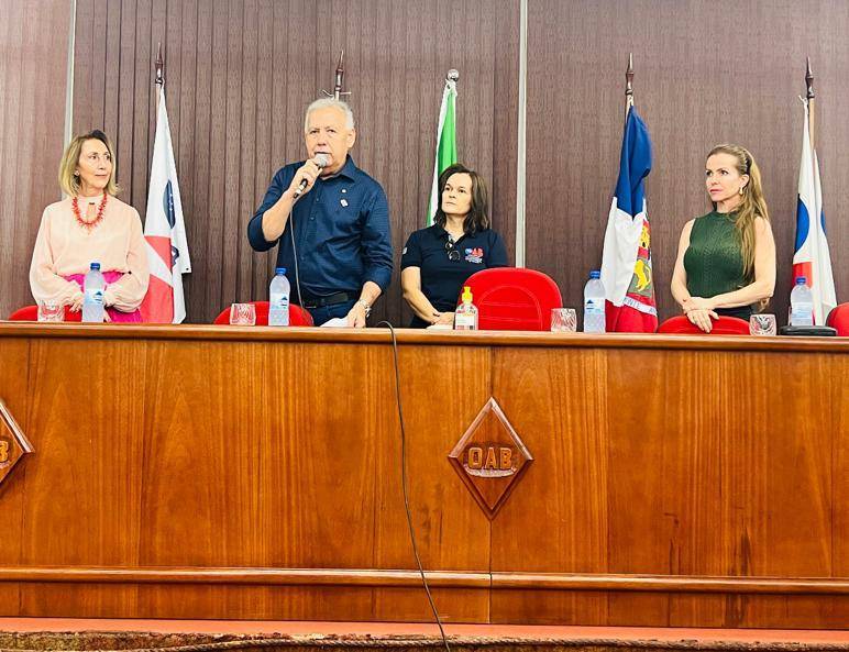 Ao fundo uma grande mesa de reunião, da esquerda para a direita compondo a mesa: o presidente do Rotary Club de Monte Aprazível - Antônio Umberto, ao centro a Presidente da OAB - Dra. Audria e ao seu lado a Tesoureira da OAB - Dra.Janaína.