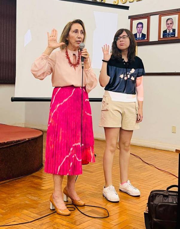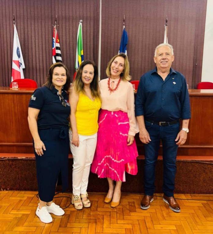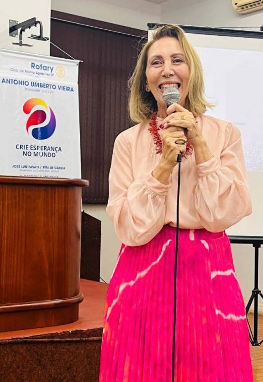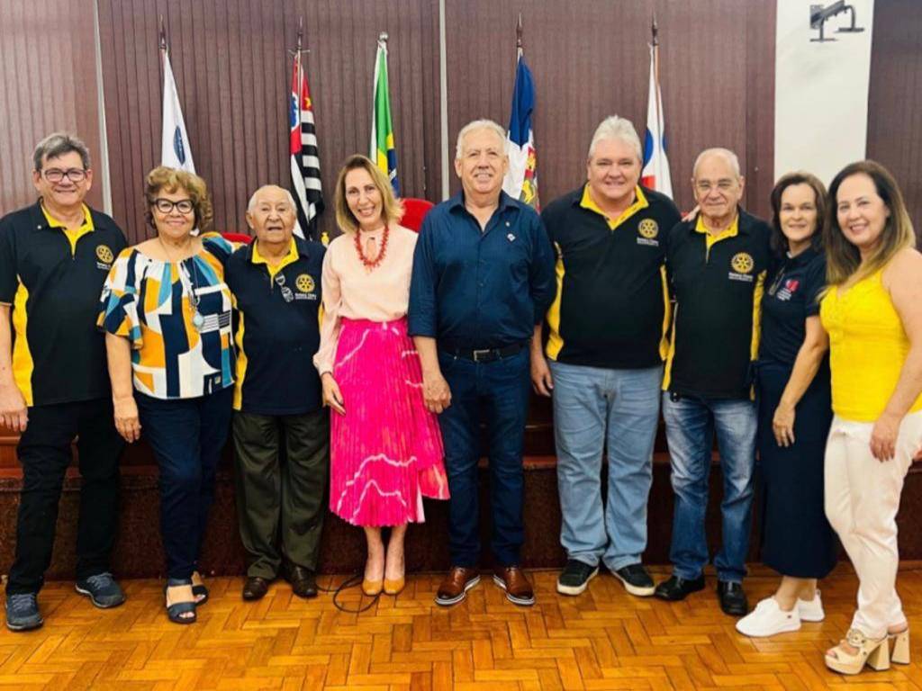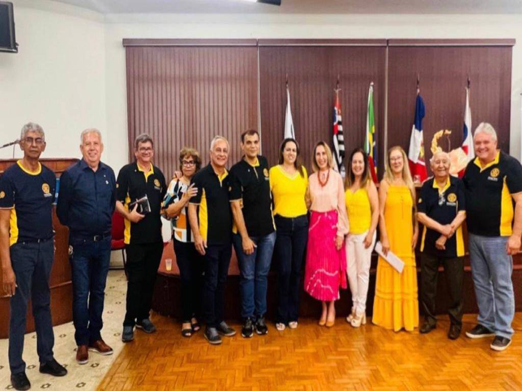 Atrás da mesa 5 bandeiras e lado direito o banner do Rotary Club de Monte Aprazível.