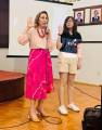 Lado direito, em pé, uma mulher loira, segurando microfone, realizando uma palestra, ao seu lado a tela de um datashow.