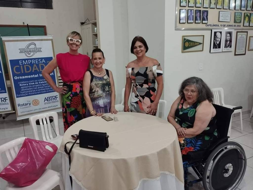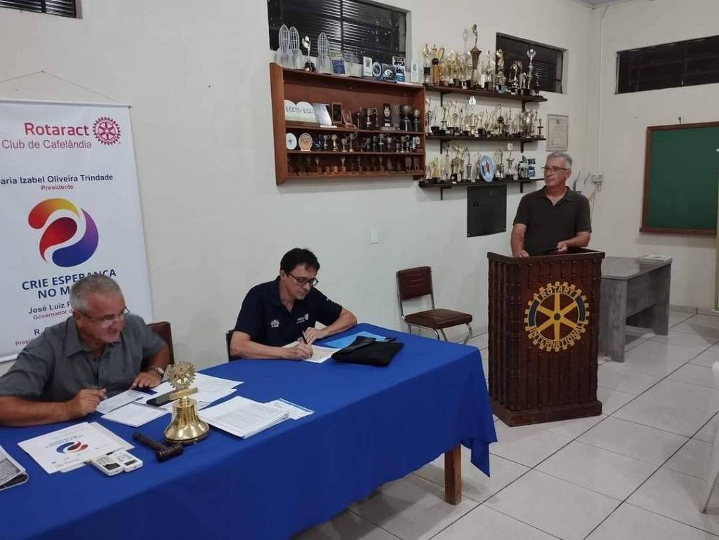 Atrás, na parede, o banner da Casa da Amizade de Cafelândia, banner do Rotary Club de Cafelândia e banner do Rotaract de Cafelândia, acima um vitro fechado.