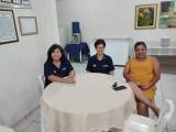 Uma mesa de madeira com toalha azul, sobre a mesa: sino, papéis, mimos. Sentados da esquerda para a direita: 1 mulher e 2 homens.