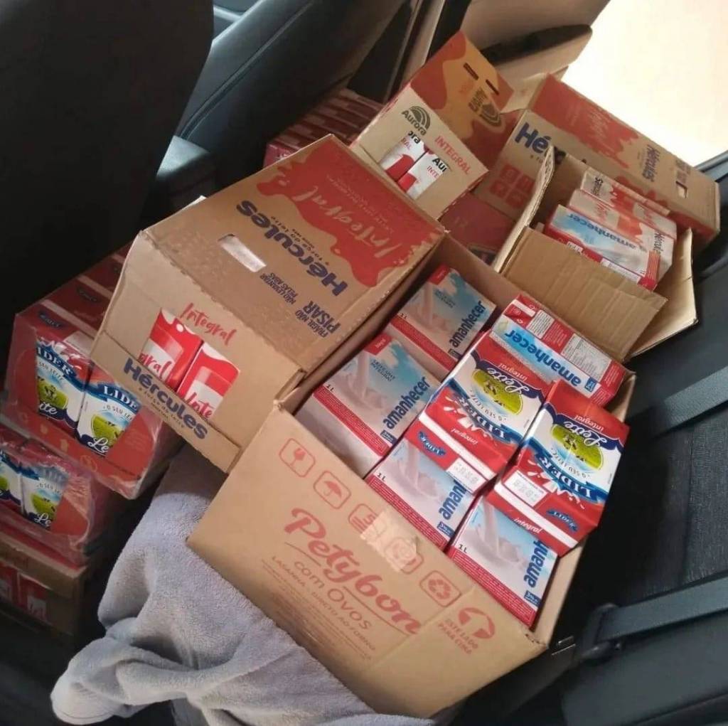 Na frente deles 3 carrinhos de supermercado cheias de caixas de leite.