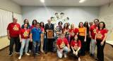 Casal Gov. Rita - sorrindo, vestido branco com listras pretas, lenço da gestão, óculos; no centro o Gov. Pavam, terno, gravata, óculos, sorrindo, com os braços abraçando as pessoas ao seu lado. Lado direito mulher de vestido vermelho, sorrindo, lenço da gestão, segurando um mimo.