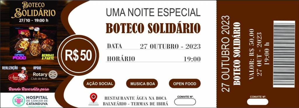 Audiodescrição: no card um convite sobre Boteco Solidário, 27/12 as 19h00. No centro imagem de comidas de boteco e copos de chopp, valor do convite a R$50,00. Open Food e bebidas a parte. Imagem de uma mulher cantando, com nome de Beth Camara, com a descrição de musica ao vivo. Ao lado imagem de um desfile de modas. Abaixo, realização Água na boca e apoio Rotary Club de Ibirá. Renda revertida para Hospital do câncer de Catanduva, Fundação Padre Albino. Local, Restaurante Água na Boca Balneário Termas de Ibirá.