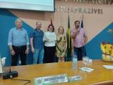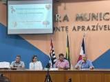 Uma mesa de madeira, da esquerda para a direita, sentados atrás da mesa: um homem camiseta cinza, óculos, vereador secretário José Carlos, uma mulher de camisa branca, óculos - Palestrante Dra.Daniela, homem de camisa rosa - vereador presidente Marcos e finalizando com um homem de camisa azul claro, com um microfone segurado pela sua mão direita e leva até a boca.