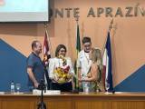 Atrás, um pavilhão com 3 bandeiras, estado de São Paulo, Brasil e do Município de Monte Aprazível.