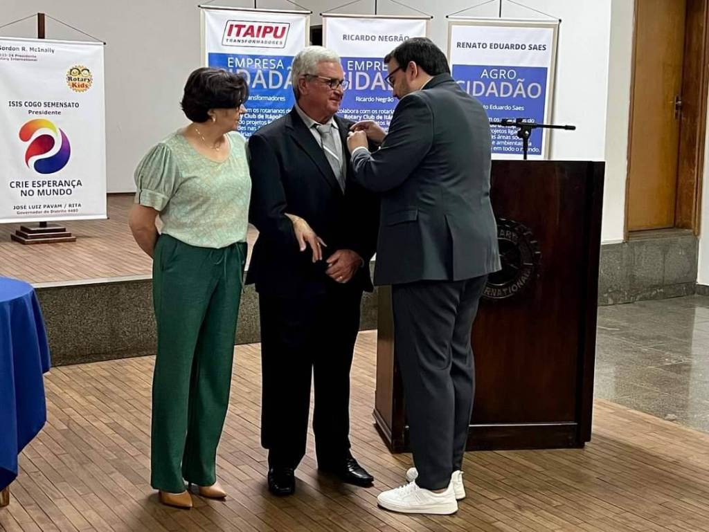 O companheiro Sérgio Visentainel e a companheira Maria Hernandes foram contemplados pelos seus padrinhos Reno Montenegro Rodrigues Bezerra e Wilson José Hernandes com o distintivo rotário e a Pres. da Casa da Amizade Daniela Sasso Ungefehr Bezerra os presenteou com a Roda Rotária e o quadro da Prova Quádrupla.