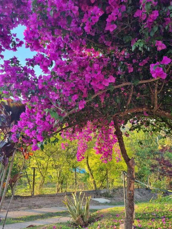 Sai do lado direito da imagem uma árvore com lindas folhas roxas.