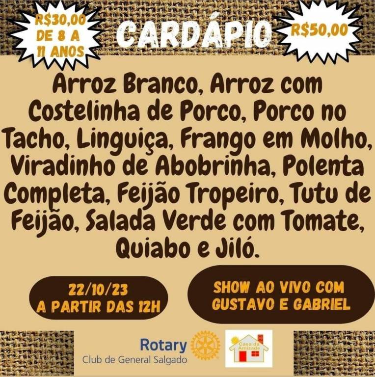 Audiodescrição: no card com fundo bege e com destaques de data: 22/10/2023 no centro em marrom, escrito ao centro: Almoço Mineiro, acima, imagem de comidas típicas mineiras, bem como lado esquerdo abaixo do card. 3000delsp3000delsp3000delspirineus s para valores de R$30,00 de 8 a 1 anos e R$50,00 adultos. Abaixo, lado direito, a descrição abaixo da data: a partir das 12h, show com Gustavo e Gabriel. Realização Rotary Club de General Salgado e Casa da Amizade.