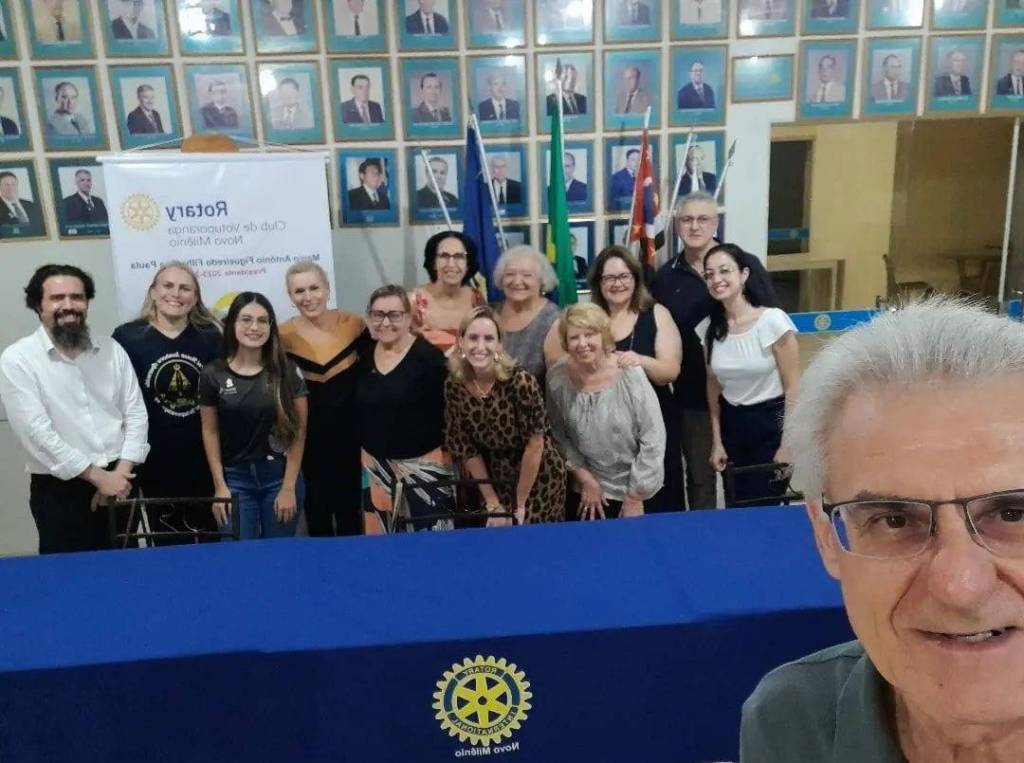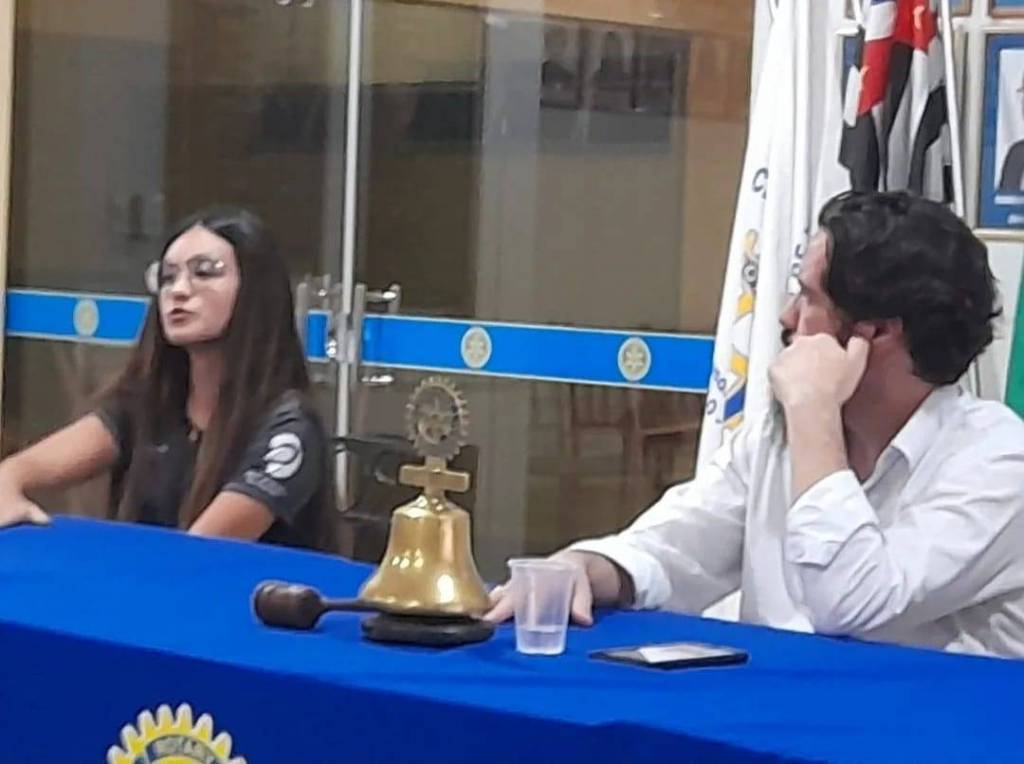 Audiodescrição: no card, uma foto de uma mesa com toalha azul e no centro o simbolo da roda rotária, em cima da mesa o sino com símbolo do Rotary, copo de agua sobre mesa, alguns papeis. De fronte a mesa, três pessoas detectadas. Lado direito uma mulher loira de óculos, com as mãos em cima da mesa. No centro um rapaz de cabelos escuros, com a mão na boca, usando camisa branca. Ao lado dele, uma jovem de cabelo longo, castanho, óculos. No fundo, pavilhão de bandeiras e algumas fotos de ex presidentes.