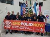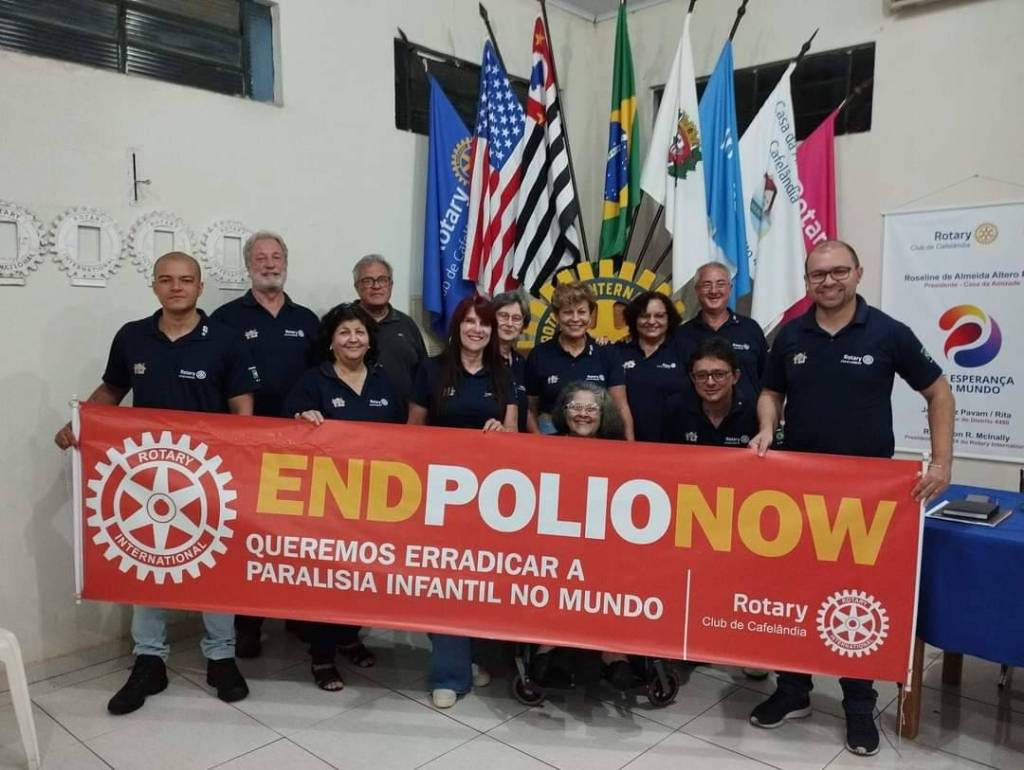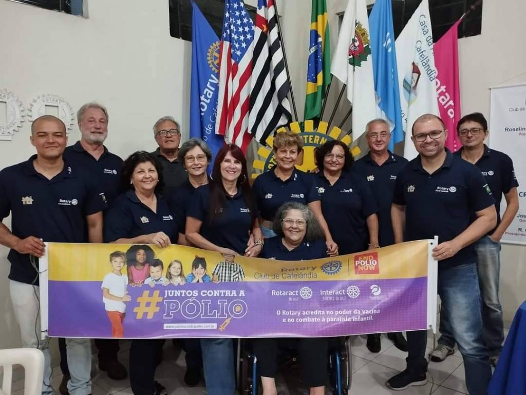 Segurando a faixa da campanha # todos contra a pólio, com o logo do Rotary Club de Cafelândia, logo da end pólio now, logo do Rotaract Brasil, Interact Brasil e o lema crie esperança no mundo. Seguindo abaixo a frase: o Rotary acredita no poder da vacina e no combate à paralisia infantil.
