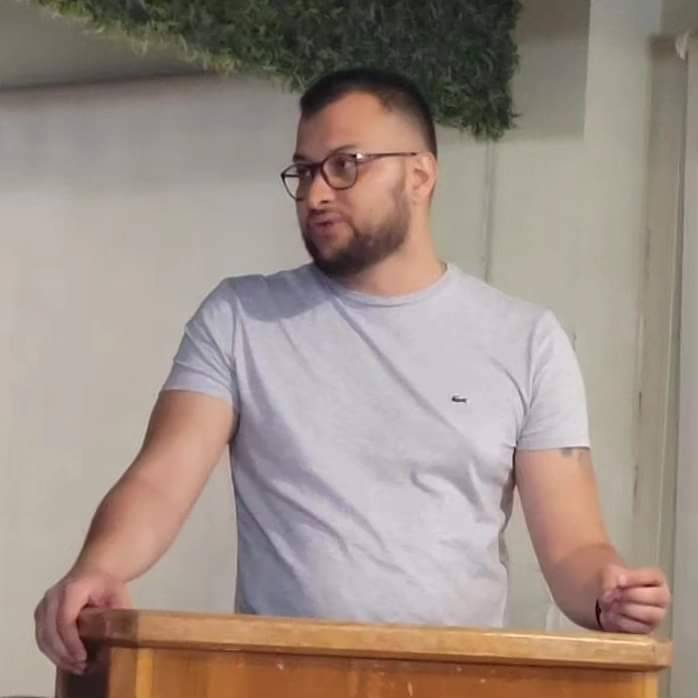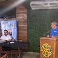 Ao centro uma tribuna de madeira com o logo do Rotary. Na tribuna um homem camiseta cinza, óculos, usa um relógio no braço esquerdo, calvo, com as 2 mais sobre a tribuna.