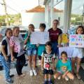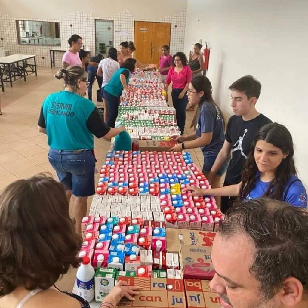 Audiodescrição: na foto inúmeras pessoas identificadas, entre jovens crianças, e adultos, todos de frente para uma mesa repleta de caixas de leite com cartazes de doação de leite. Todos sorrindo, parecem felizes e satisfeitos. No centro a mesa, um cartaz do Rotary Kids de Santa Fé do Sul.