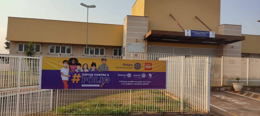 Audiodescrição: na foto inúmeras pessoas detectadas entre homens e mulheres, alguns sentados outros em pé em frente a uma mesa, todos sorridentes. Na frente da mesa tem um banner com imagem de crianças #juntos contra a pólio e símbolo do Rotary Club de Ilha Solteira, Rotaract Brasil, Interact Brasil, lema do crie esperança no mundo e símbolo da END POLIO NOW. Atras das pessoas da mesa, símbolo da roda rotária ao centro, e na parede, varias fotos de antigos presidentes.