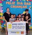 Na frente desta moldura da esquerda para a direita: uma mulher blusa preta, bermuda marrom, cabelos presos, 7 crianças e uma mulher blusa preta, cabelo curto preto. Estão segurando um banner branco escrito: