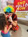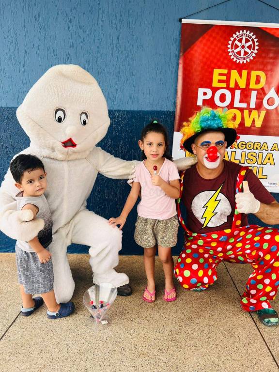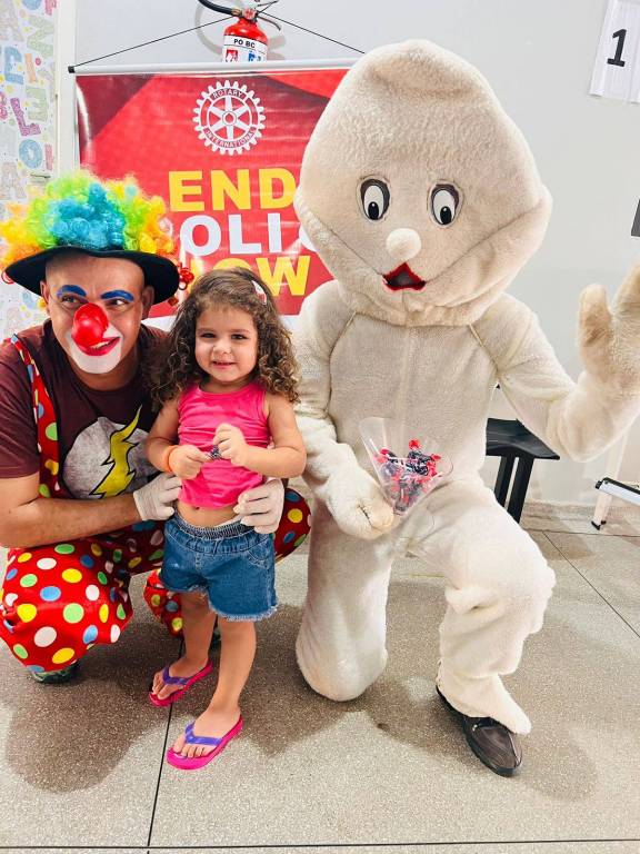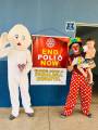 Na frente de um posto de saúde, Zé Gotinha, palhaço, enfermeira e uma criança. Na parede um banner da end pólio now e do Rotary Club de Monte Aprazível.