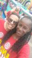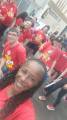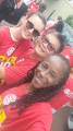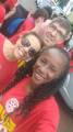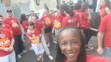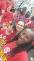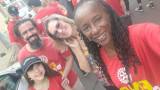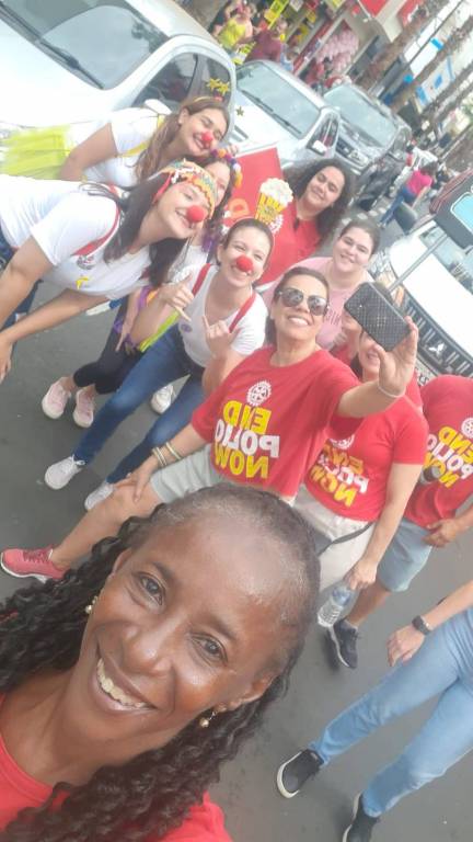 Oito pessoas, com camiseta vermelha da end pólio now, junto com 2 super heróis. Sorrindo.
