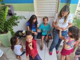 Uma mulher de camiseta branca, calça jeans, loira, cabeça abaixada, na mão direita um pincel fazendo um desenho na mão esquerda de uma criança. Aparenta estarem na frente devem posto de saúde.