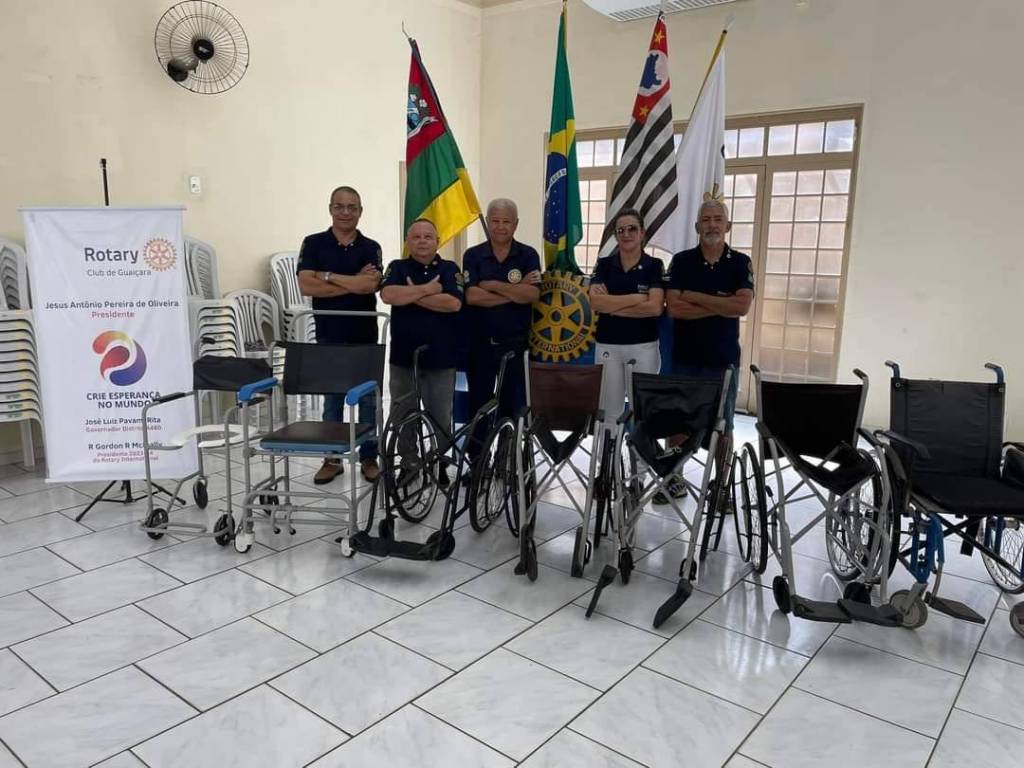 Quatro homens e uma mulher, camiseta do Rotary, todos de braços cruzados a frente. Na frente 5 cadeiras de rodas. Ao fundo o logo do Rotary e o pavilhão nacional com 4 bandeiras.