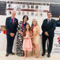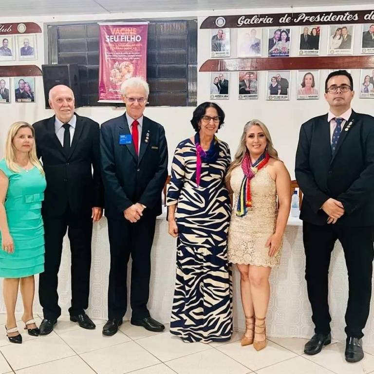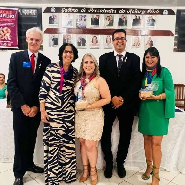 Mulher de vestido verde, loira, um senhor de terno e gravata (Casal Prefeito da cidade), casal Gov. Pavam (terno e gravata) e Rita ( vestido longo branco e preto), seguindo o casal presidente do Rotary Club de General Salgado Ilta ( vestido curto bege) e Anderson (terno e gravata).
